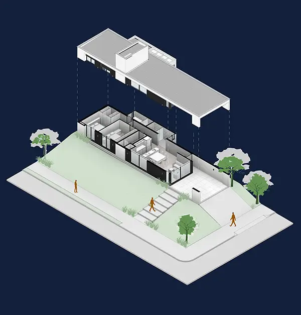 A casa, com ambientes integrados, foi planejada para ser extremamente otimizada, aproveitando todo o potencial visual do terreno.
